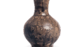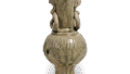 The shape of the body, with its stiff shoulders and ridges, differs slightly from that of Figure 132, but the base material and the floral design suggest that they were fired in the same kiln. This piece does not have a rounded design on the oral part, but has the same unit design stamped on it. It has a high ash content and is almost dark green in color.