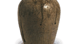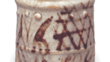 This four-foot vase is similar to a large folded-rimmed deep dish, but in terms of the mouth rim construction, it should be considered a large grater dish. It is made of a rough grayish-white base, and after water-glazed molding, the bottom has been ground and adjusted. The inner bottom is sharply engraved with grating marks. The ash glaze is oxidized and fired, so the color is similar to that of a yellowish axis, but the half-surface has been left white.