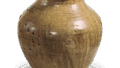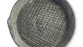 This shallow bowl or deep dish was probably used as an everyday vessel. It has both an ash glaze and an iron glaze, and is a type of vessel with a short life span that was seen only during the entire 14th century. It has a flat bottom with a rounded double-edged rim. The inside has a double circle of eyes, between and in the center of which is stamped a small eight-flower design. The ash glaze is neutral and has a relatively clear green color. The sleeve layer is thin.