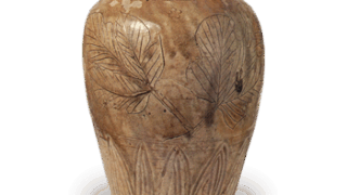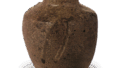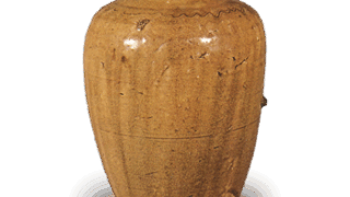 This large jar has an upright neck with the apex of the mouth folded outward, and the shoulder is decorated with a single sunken line and three lateral ears. The base is made of sandy clay, and the body is formed in a ring shape with a three-tiered joint. The lower half of the body was adjusted by using a diagonal piece of wood to adjust the vessel surface. This technique is also seen in medieval Kaga kilns, and it is difficult to determine which one was used.