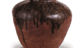 This slightly wide-mouthed, medium-sized jar has a strong shoulder tension and a shape similar to that of an arithmetic slab toward the small bottom. The N-shaped fold at the mouth rim is even larger, creating a broad rim band. The shape of the mouth rim and body indicates that it was made in the late Kamakura period. It is made of iron-rich clay and is well fired to a brownish-brown color, with a thick layer of dark green natural glaze covering the shoulder and part of the body. There is a chrysanthemum design on the shoulder.