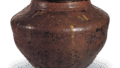 This is a large, flat jar with a remarkably large diameter in relation to its height. In view of its shape, it is thought to have been made in the Nanbokucho period. The clay is coarse with many fine grains of feldspar and is not fully fired, giving it a brownish-brown color. The folded edge of the mouth band is very wide. There are two stamps on the shoulder and a 箟描 kiln mark, which is rare in Tokoname.