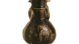 This is one of the small jars with carved design, a specialty of Atsumi, and is thought to have been made in the 13th century based on the slightly narrowed neck and straight waist line. The base is gray and rich in sand, and the clay is rolled up and molded. The body is adjusted using me vertically and the surface of the vessel is brushed with a brush. The engraved design on the shoulder is similar to that on a medium-sized jar excavated from the Tsubozawa kiln, with an arc that opens to a figure eight on top of two parallel sunken lines, with a meandering sunken line between them. It is well fired, with natural glaze on the shoulders.