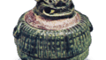 The four most famous. This tea caddy was made in the Han style. This tea caddy was owned by Aoki Gyobu Houin Joken, hence the name. It is known for its unique characteristics as a Han style piece, such as the curious distortion of the mouth structure and the interesting scenery of the slightly reddish flying patterns on the overall blue glaze. It was once owned by Mori Mimasamori Tadamasa, but was returned to the Tokugawa Shogunate. 1657 saw a major fire in Edo, but fortunately it was not seriously damaged and was repaired with lacquer. (It was later handed down to the Sakai family in Himeji.)