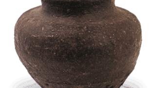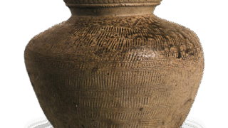 Although the place of excavation is unknown, it is clear at first glance that this is a sutra tube vessel, as there is a shadow blue gouko (a small vessel with a blue lid) that is said to have been produced with it. The body is decorated with an inscription in the shape of a robe with five parallel sunken lines and eight intersecting vertical lines. The top of the lid is detached, but the curved part is decorated with the same kesa-dasuki design as on the body. The clay is grayish-black and dense, and the molding is extremely careful. The firing was also good, and the side rim of the body is partially covered with a yellowish-white natural glaze.