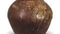 This type of bimimi jar with two ringed ears on the shoulder is unique to Echizen and was produced from the late 15th to the 16th century. The short, outer neck is folded back to form a ball rim, and the center of gravity is still in the upper half of the body despite the sloping shoulders, indicating that this type of twin-eared jar belongs to an ancient style. The clay is grayish-white and coarse, with a few pebbles. The lower half of the body is slightly under-fired, but the upper half is well-fired. The natural glaze is applied generously from the mouth neck to the center of the body, flowing down at an angle. Furthermore, some of the glaze that flowed down the center of the body went in the opposite direction and accumulated round the end, indicating that this jar was tilted when the glaze began to melt, and fell down and turned upside down when it was fired. There is a kiln mark on the shoulder, but the lower half of the mark is not clear because it was scraped off by a horizontal nadir during shaping. In addition, there are other ceramic fragments stuck to part of the shoulder. This is a typical Echizen twin ear jar.
