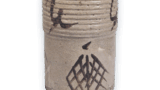 This is a typical ground bowl from near the end of the Muromachi period. The flat-bottomed, shallowly open body has eighteen grating marks made radially on the inner surface using an eight-fold comb. It is slightly under-fired and has a light brown color. The thick concave lines on the inner surface of the mouth are also characteristic of this period.