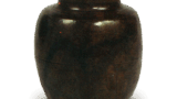 Chukoh specialty. Kinkasan tea caddy, Seto tenmoku hand. This small tea caddy has a glaze of amber with purple tints and a luster similar to that of tenmoku. Originally owned by Kobori Enshu, it was handed down to the Matsudaira family in Unshu since Matsudaira Fumai asked for it with 10 gold pieces around 1789 (1801). (Meibutsu Ki, Kokin Meibutsu Ruiju, Rimpo Kameryu, Taisho Meikikan)