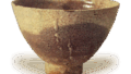 (1) Hard and dense in texture with thin walls, and generally made on the potter’s wheel. (2) The entire surface of the vessel (the geology is exposed on the exterior bottom) is covered with a deep glossy black glaze. (2) Vessels with a slightly softer texture and a slightly thinner body, glazed with a smooth black glaze over the entire surface (the texture is exposed on the exterior bottom) and decorated with a chrysanthemum, cherry blossom, or diamond-shaped motif in white. (3) This type of ware is similar to Shino ware, but the geology is softer and all of them were made with a finger-head, so many of them have a different shape called a kuboshiki or kutsugata. This vessel has a very elegant appearance, with a thick layer of pale black glaze applied to part or half of the body, and a grass pattern painted on it. The above (2) and (3) refer to black oribe.