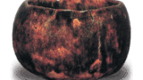 The tea bowls of Chojiro are often small and rarely large, which is the result of Rikyu’s preference for small bowls for his Souan Wabicha (hermitage Wabi-tea). Some Chojiro pieces have brownish tones in the black glaze, some have white glaze floating in the red glaze, and some have a kind of unique glaze quality that cannot be duplicated by others. The description “At first, the shape of the ware was aimed at the Korean wares of Ido, Kumagawa, Tamagote, Irabo, etc., but it gradually developed a kind of ingenuity and finally opened the gate to the first-class Raku ware in Japan, In terms of technique and workmanship, it is said that the kiln technique was almost exclusively hand-kneaded, without the use of a potter’s wheel, and that each piece was fired one at a time in a small, swinging kiln or bellows, which could also be called a private kiln. There are two opinions: one says that they were fired at low heat and left to cool, and the other says that they were made with scissors. The bowls that are considered to have been left to cool are naturally covered with ash and have no luster on the glaze surface. If the bowl is ever replaced by fire, it will be grayish-white in color. Therefore, the yuzu skin on the surface of the bowl also appears naturally, and it is almost impossible to recognize the luster when compared to the later ones. The red color of the ware is fired in a brownish-brown or light-white style due to the fire color. The clay used for the bowl came from the Okazaki area, and the black material for the overglaze was black stone, commonly called “makuro,” found on the riverbank between Shijo and Gojo.