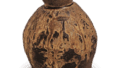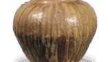 This small jar has a short, upright neck with a rounded tip, and the rim of the mouth is partially bent to form a one-way mouth. The rim of the mouth is partially folded to form a one-sided mouth. The body is nearly spherical in shape, and the lower half has been shaped by grinding, while the upper half has been adjusted by using a brush horizontally on the surface. The reddish-brown body is covered with a yellowish-green natural glaze on a part of the shoulder. There is a kiln mark slightly above the body.