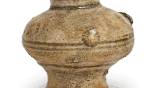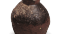 This is an o-haguro jar of the same shape as the former, but the curve from the shoulder to the body is a beautiful arc, giving it the shape of a tokuri (Japanese sake bottle) itself. The base is well fired and reddish in color, and the entire surface from the mouth rim is covered with a thick brown natural glaze with a remarkable luster. There is a mark on the shoulder.