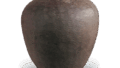 This piece is the most characteristic of Suzu ware, which is characterized by its black color. The top of the upright neck is thickened and beveled to a width of 9 mm. Another characteristic of this period is the outward protrusion of the center of the mouth and neck. The entire surface of the body has been beaten and tightened in the shape of twilled cedar, and the body is beginning to show a slight tendency toward a polyhedral body. The side edges of the bottom are shaped by cutting out the beaten pattern with a pommel. It is dated to the mid-14th century.