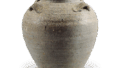 The top has a concave rim similar to that of a double-mouthed vessel. It is made of slightly coarse clay and rolled up with corded clay, and the bottom has marks of still thread cutting. It is well fired and grayish-black in color, with a natural glaze of white sesame powder on the shoulders. It has a two-tiered shoulder and a one-tiered body with a wavy comb pattern. This is an old type of small jar, possibly dating back to the end of the Kamakura period.