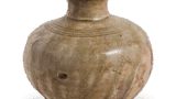 The tip of the neck is twisted outward to form a rim band, giving the piece a slightly long-bodied appearance due to the loss of shoulder tension. It is made of iron-rich clay containing fine particles of feldspar, and is well fired, giving it a blackish brown color. It is similar to Iga clay. The yellowish-brown natural glaze that hangs from the mouth rim to the shoulder flows down to the lower half of the body and turns into a candy color at the bottom, showing the interesting change of glaze.