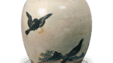 A small jar with a raised tip at the neck of the mouth and a rim band on the exterior surface, probably a type of seed jar. It was fired using an extremely iron-rich clay containing large particles of quartz and feldspar, and the low refractoriness of the clay caused significant distortion at the mouth rim. The clay was rolled up and molded, and the surface of the vessel was adjusted by scraping. The dark brownish-brown surface is covered with a natural glaze, giving the vessel a blackish-brown color.