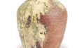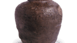 The body is made of dense clay containing many fine particles of feldspar, and the firing has been tightened so that the brownish-brown surface of the vessel looks as if it were covered with molten feldspar and sprinkled with white dots. The mouth neck and one side of the body are covered with a dark green natural glaze, which has fused with the feldspar and turned the surrounding area white.