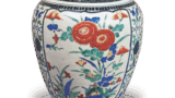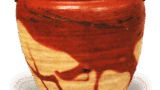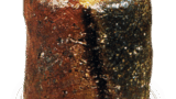 Bizen ware did not begin to show its distinctive reddish-brown fire color until the late Kamakura period (1185-1333). At this time, reduction-fired pots were still in operation, and some of them were gray, so it is not possible to determine the period only by the color of the fire. The diameter of the neck of this jar is almost the same as that of the base, and the sloping shoulders suggest that this jar was made in the late Kamakura period. It is relatively thinly molded with a cord-shaped body, and the high firing temperature has caused considerable firing distortion. Three parallel sunken lines are drawn on the shoulder, and an inscription with two overlapping ovals is painted between the upper two lines. There is a circular mark on a part of the body, which is carbonized black, creating an unobtrusive scene. The body is covered with a cloudy white natural glaze from the mouth rim to a part of the body. The fire-colored coloring on the surface of the vessel is the best of all the ancient style jars with a sunken line design, and it is one of the representative examples of the late Kamakura period.