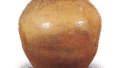 This is an imposing large jar with a short, convex lip and strong, stout shoulders. Although the neck of the mouth is slightly smaller, the sharply drawn edge of the mouth, the shape of the mouth, and the tension of the shoulders suggest that it was made in the Nanboku-cho period. The body was formed by grafting several steps, and the surface of the vessel was shaped with a brush. The clay is of high quality, rich in fine particles of feldspar and silica, and is well tempered, giving it a brownish-brown color that harmonizes with the dark green natural glaze on the shoulder, creating an ethereal atmosphere. A paulownia design is painted on the shoulder, and a wind seal is engraved a short distance away. Many of the excellent Tamba vases with engraved designs are from this period. This is one of the finest of the ancient Tamba large vases.