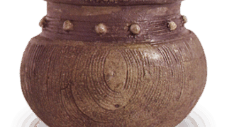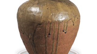 The body is made of rolled-up cord and clay, and the surface is polished and brush-marked. There are two “X” marks on the shoulder. There are three marks on the bottom rim. The ware is well fired, with significant natural glaze runoff.