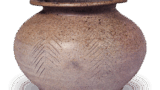 This small jar has a flat rim with a short, thickened outer lip and a sloping outer rim, and is molded with rolled clay.