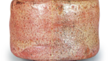 This tea bowl also has a Raku character mark stamped in the center of the base. Since the yuzu is thickly covered, it is not clear whether it is the same mark as in the previous figure or the mark known as the Jokei mark. The workmanship is similar to the “Jirobo” shown in Figure 43, with the mouth held slightly inward in a gentle manner, the so-called Rikyu style. The glaze is brownish, but it is well melted and has a slight luster. On the back of the lid of the inner box, there is an inscription by Jyoshinsai, “Nidaime Kurocha Bowl, Mei Shihaguri Left (Hanashii)”. This may be because he judged that the seal stamped on the high stand was the Jokei seal, so he wrote “Nidaime” (second generation).