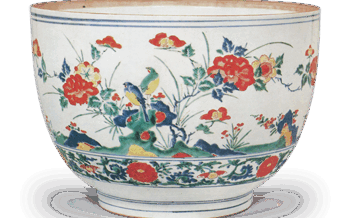 Important cultural property Large deep bowl with flower-and-bird design, enamelled ware
