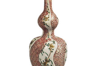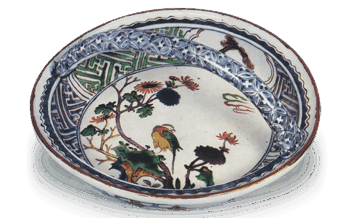 Kokutani Dish in the shape of open flower with mandarin duck design, enamelled ware