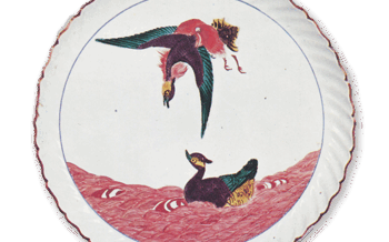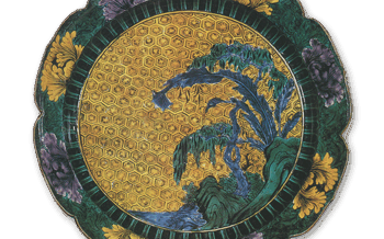 Dish in the shape of open flower with mandarin duck design, enamelled wareHeight 2.5 cm, mouth diame...