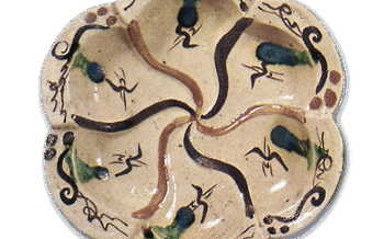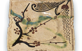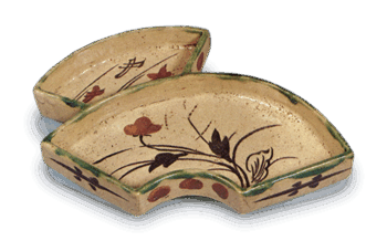 Oribe Oribe dish in shape of fan with flowering grass designs Oribe dish in shape of fan with flowering grass designsHeight 3.4cm, Bore 12.6cm x 18.8cm, Tripod Th... 2024.02.26 OribeTea Utensils