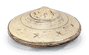 Mokubei: incense caddy in the shape of the character "Raku", blue and whiteHeight 2.9cm, Diameter 7....