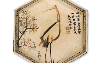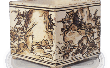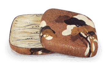 Kenzan: set of deep small bowls with different designs, underglazebrown and blueKenzan: set of deep ...