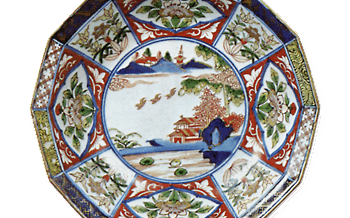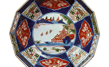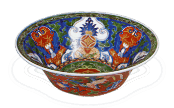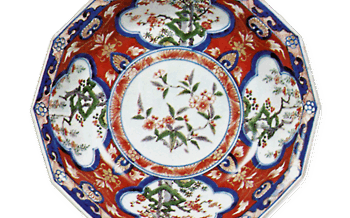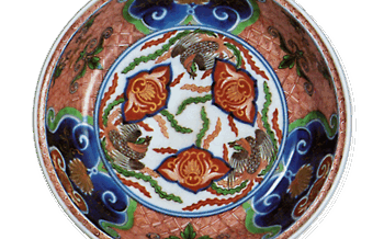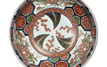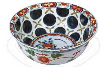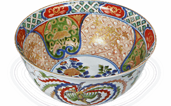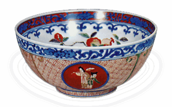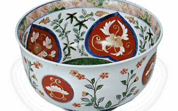 KoImari Bowl with design of peonies and figures in roundels, enamelled ware