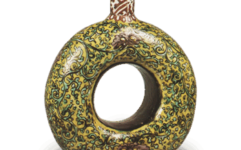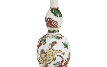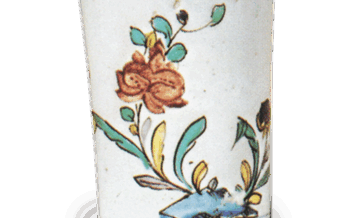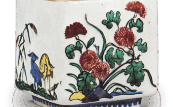 Five wine cups with flowering grass design, enamelled wareSix wine cups with peony design, enamelled...
