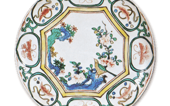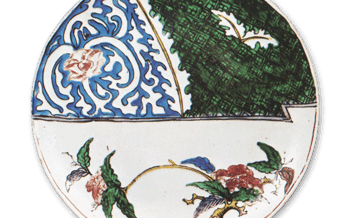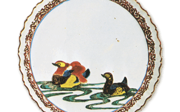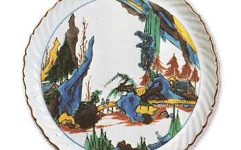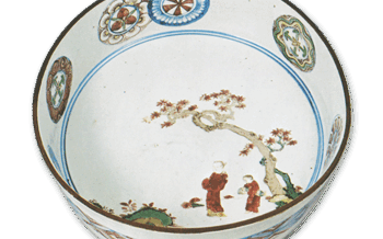 Bowl with design of two figures under the tree, enamelled wareHeight 7.9 cm, mouth diameter 20.4 cm,...