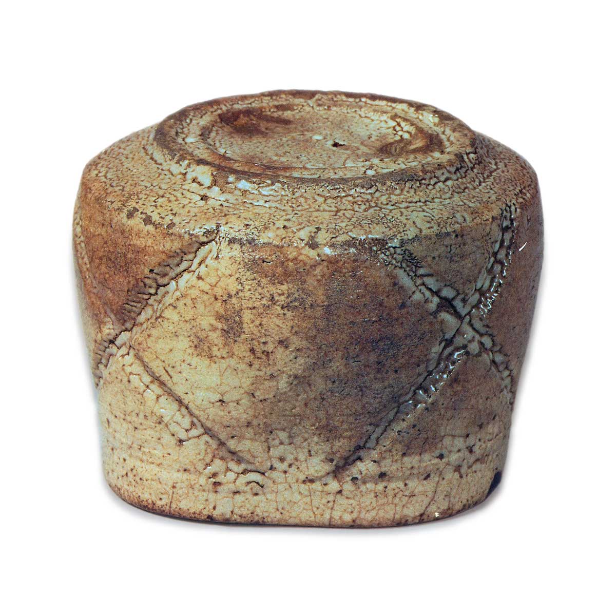 这是为数不多的雕唐津茶碗的代表作。高台极低,呈四方筒形,整体厚实沉稳,手感略重。四方筒形的胴部各面均以深雕的“×”纹样强调力量感。此类雕唐津或雕绘唐津传世品极少,但所有已知作品均带有“×”雕纹样,颇为有趣,推测可能是某一时期应特别订制而作。