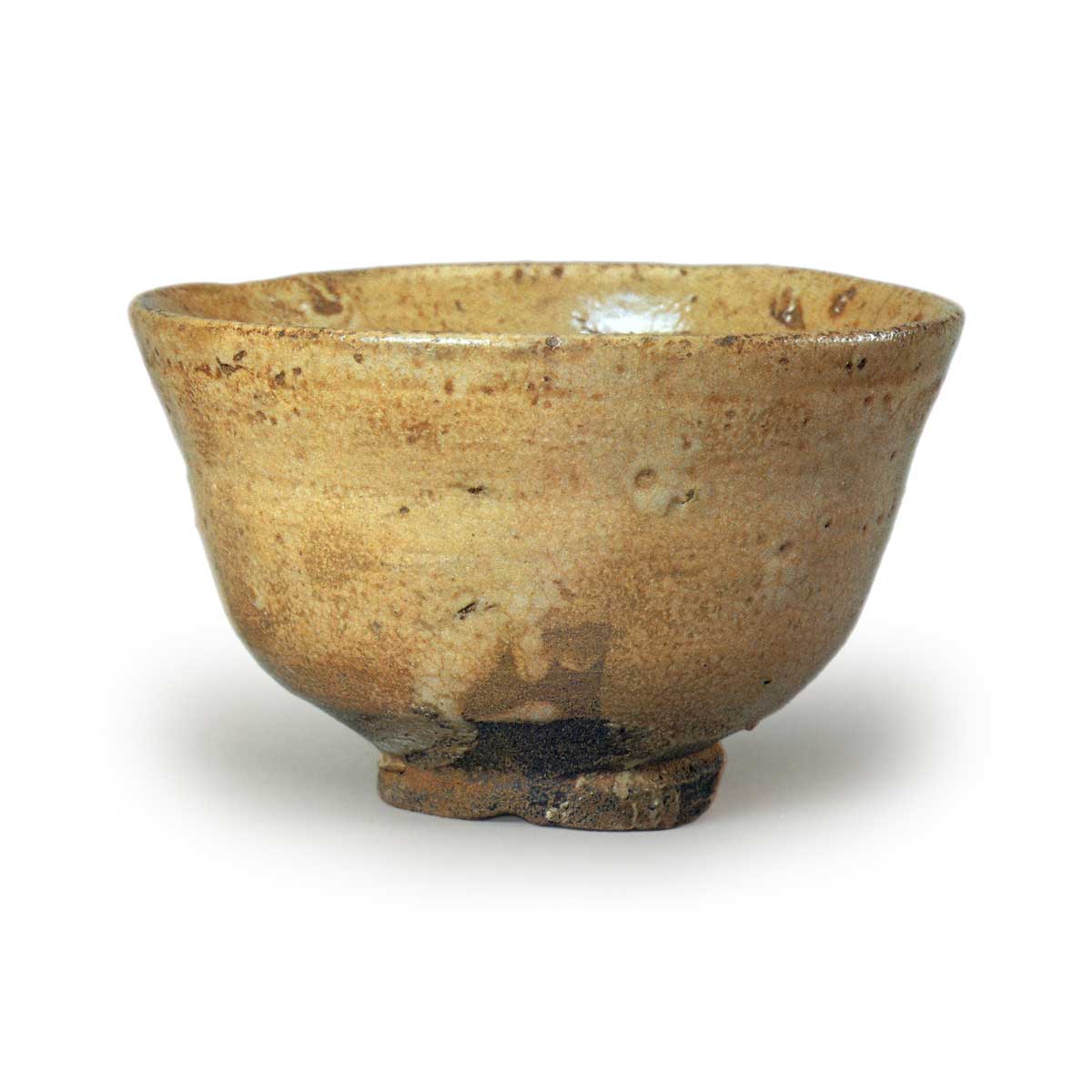 虽为小服茶碗,但呈现出所谓的奥高丽风格的形制,属于古唐津釉色,是极为罕见且富有韵味的制作风格。从竹节状削出的较低高台至口端,作工抑扬有致,整体虽规整却不失灵动,尤其是高台内外削刻、腰部张力、釉内边缘反卷的韵味, 深邃的见底等,这些独特特征的高台部分,几乎整个器身都覆盖着古唐津特有的朽叶色釉面,釉色厚薄均匀,尤其是外侧腰部至高台处的釉与土色的融合,呈现出浑然天成的景致,令人回味无穷。高台底部略薄,高台内中央有小幅立边。