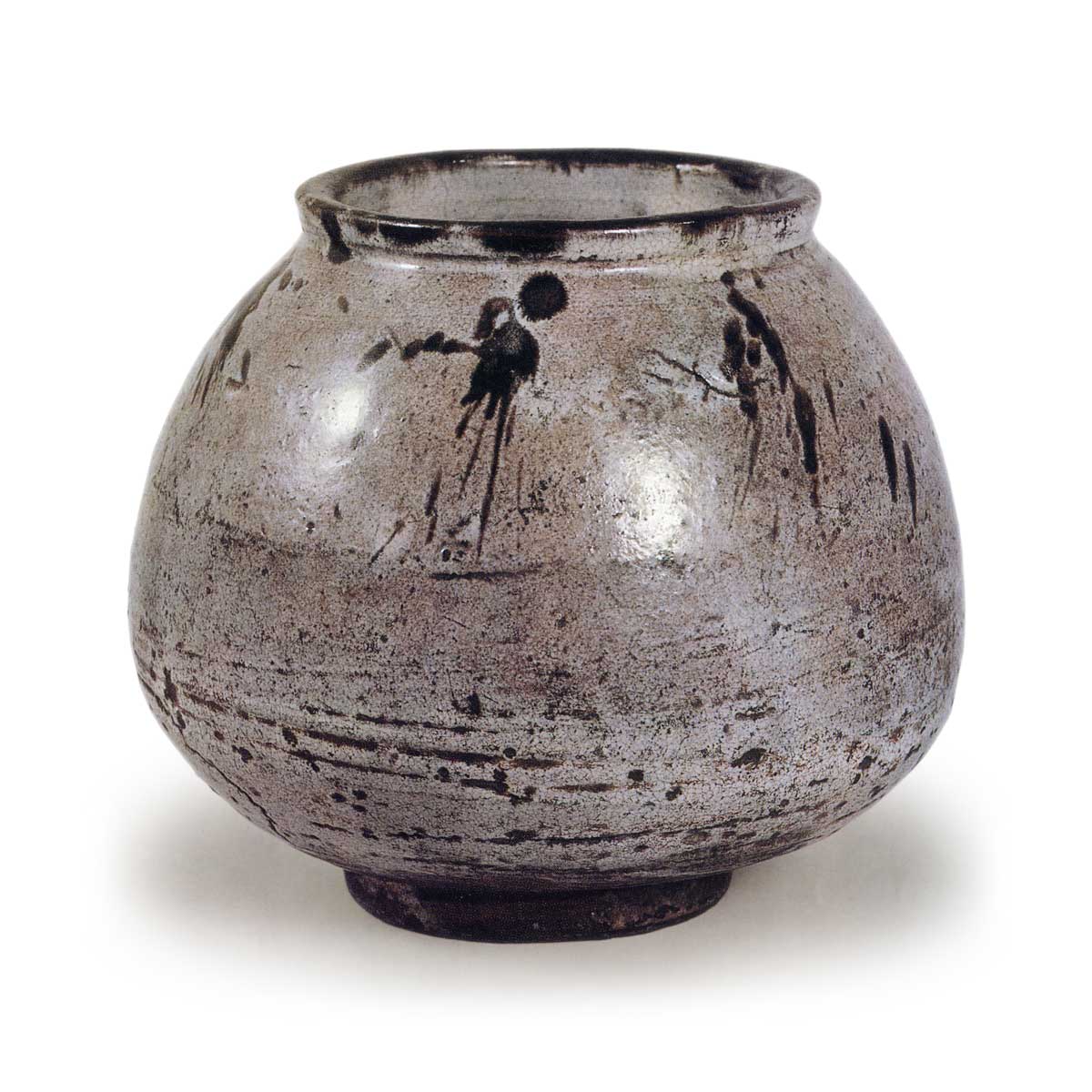 与李朝的壷相似但并非李朝风格, 仍具有唐津特有的韵味。在众多唐津壷中,其制作风格尤为有力, 且仅存数例,因此备受推崇。 全体厚实, 高台呈竹节状牢固削刻, 丰富的器身张力与宽阔的口部造型为此壷赋予了强烈的力量感。口部涂有铁釉,肩部孔洞处以铁颜料点缀,除高台外全身覆盖厚重的稻草灰釉,属于典型的斑唐津风格。器身有釉下附着痕迹,腰部留有指痕, 高台内残有两三处飞釉,高台内露出缩绉皱纹的红色土胎。推定为松浦系大川原窑的作品。