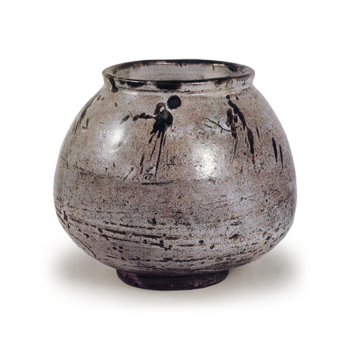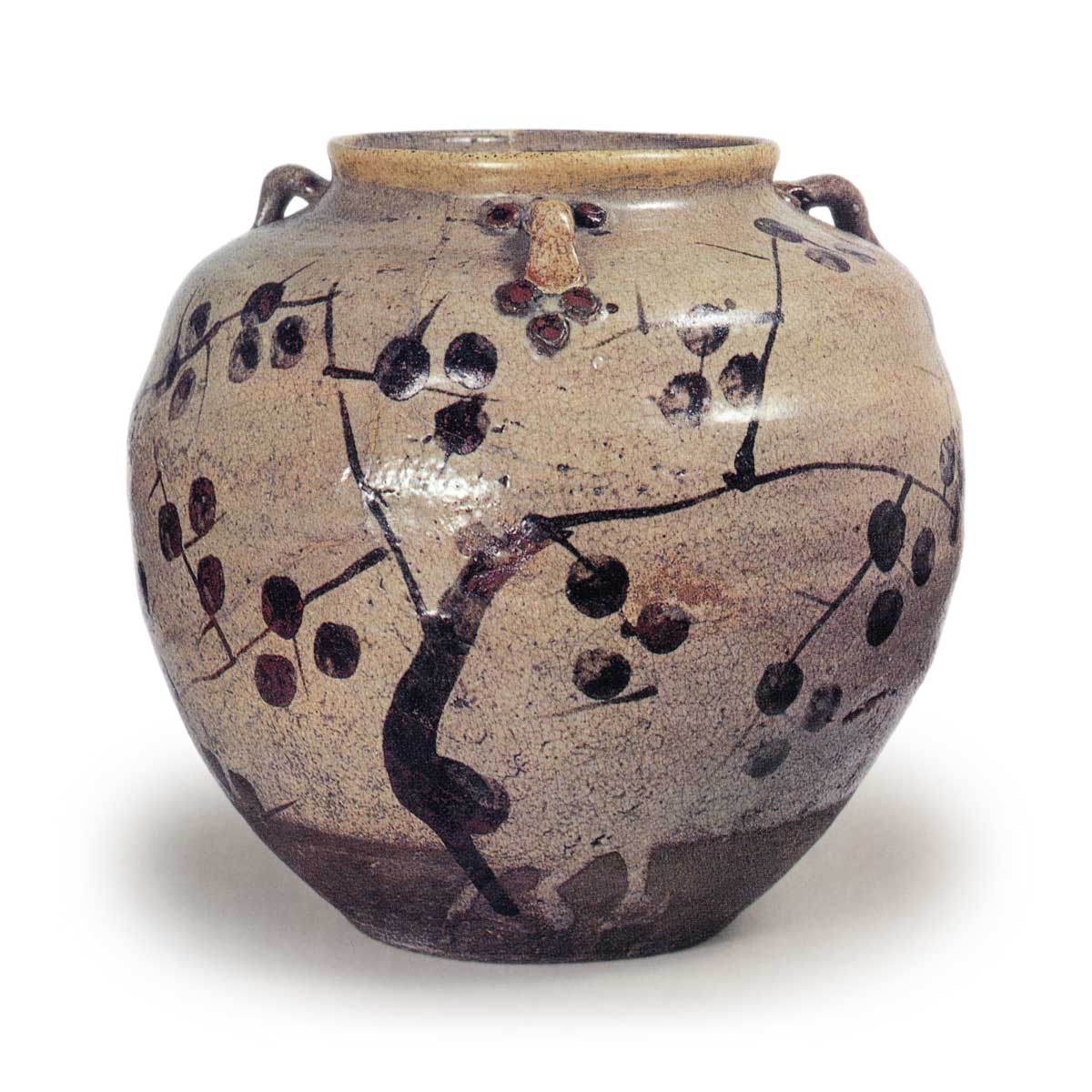 说到绘唐津,这件作品必定会出现, 它独具魅力,无与伦比。这件陶罐造型优雅, 肩部三面各有一只耳,耳根上方有两处,下方有三处磨座, 这种形式的绘唐津三耳罐实属罕见。这件陶器的价值在于其胴部绘制的柿子状果树图案,虽笔触质朴,但笔触流畅,以树干为中心向背面延伸,左右分枝,每个枝上都结有三个果实,颇具趣味。据一说,此图案可能是家纹的变体。壶身下部内外均覆盖着混有土灰的长石釉,釉面柔和,可见细小的釉裂纹。高台低矮,高台内壁的削刻也较浅。口部有较大破损。这件作品很可能是作为茶壶在甕屋谷窑制作的。
