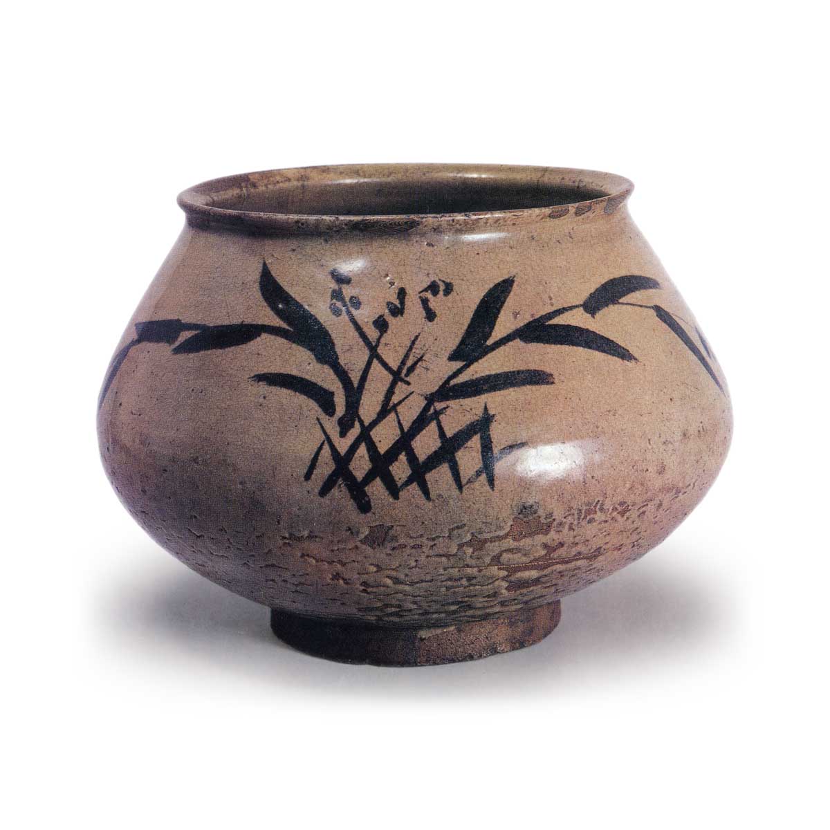 绘唐津芦纹壶 唐津绘唐津芦纹壶 2025.07.29 绘唐津芦纹壶 高度16.1厘米 口径16.6厘米 胴径22.9厘米 高台径10.7厘米出光美术馆胴部强劲张力,呈算盘玉形的壶,作为绘唐津的代表作广为人知。口部宽阔,低而尖锐,边缘外翻,高台直接从胎体削出,坚实厚重。 壶身一侧以熟练的笔触绘制了向左右展开的芦苇与花草纹样, 另一侧则以舒展的笔触描绘了屈轮唐草纹。除高台外,全器施以混有土灰的长石釉,但器底部分釉面有收缩现象。 作为绘唐津陶器中的大型作品,其形制与日本民艺馆藏品完全相同。 类似的陶片曾在市之瀬高丽神窑址出土。