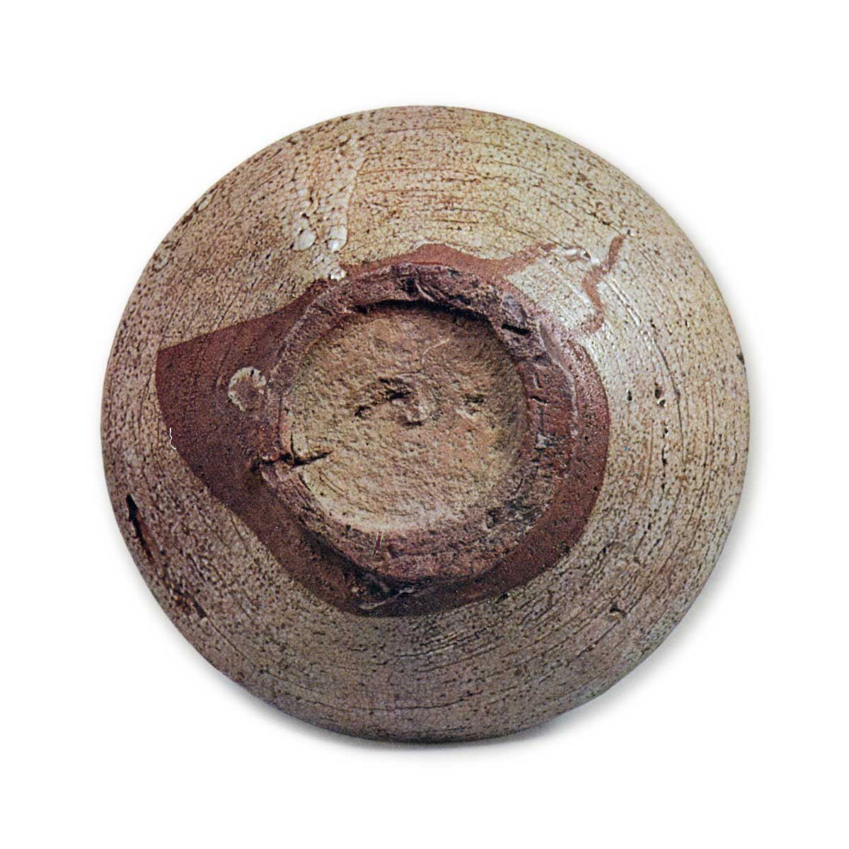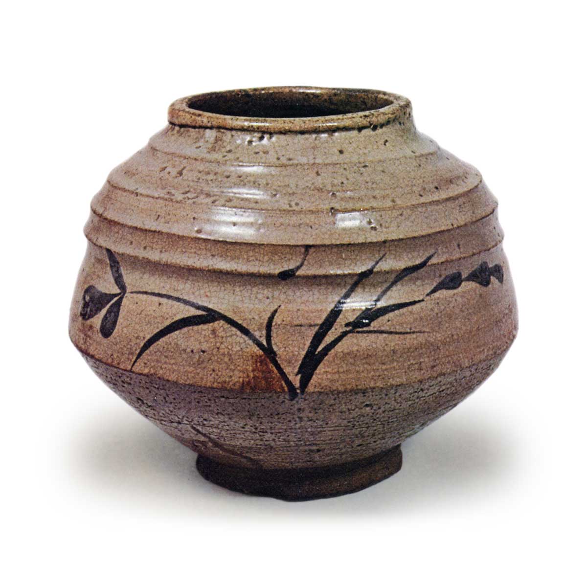 壶身底部宽阔稳重,从胴部至口部呈五段深轮纹,腰部的棱线清晰,整体造型紧凑有力,给人留下深刻印象。腰部至高台部分缓慢削磨,高台削磨亦随性自然,釉色与制作手法极具韵味。 壶身两侧描绘的草花纹样笔触轻盈灵动。 窑址推测为平户系或椎之峰。