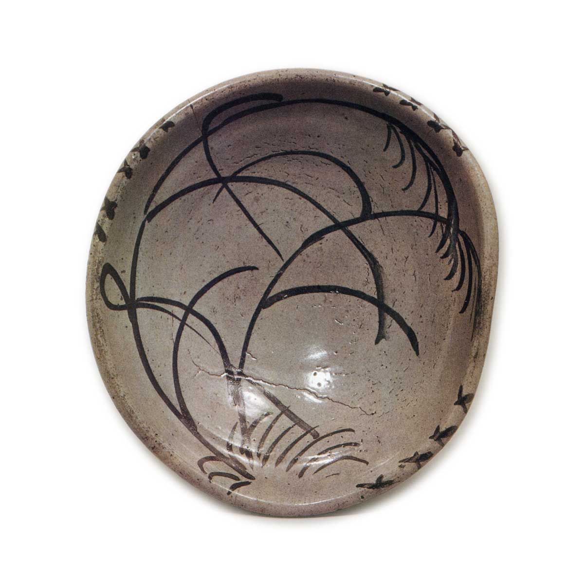 绘唐津芒纹鉢 唐津绘唐津芒纹鉢 2025.07.29 绘唐津芒纹鉢 高度9.5厘米 口径21.3×23.7厘米 底径8.3厘米碗口高耸,碗身宽大,边缘向内卷曲形成珠边,一侧压平并扭曲成椭圆形,高台略高,两侧切入形成分高台。鉢内满布两株浓黑芒草纹样,除高台外,全面厚涂混有土灰的长石釉。釉面呈带青灰色的烧成效果,鉢内略带红色。此类大型深鉢极为罕见。可能是甕屋谷窑的作品。