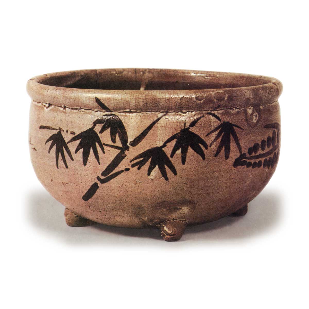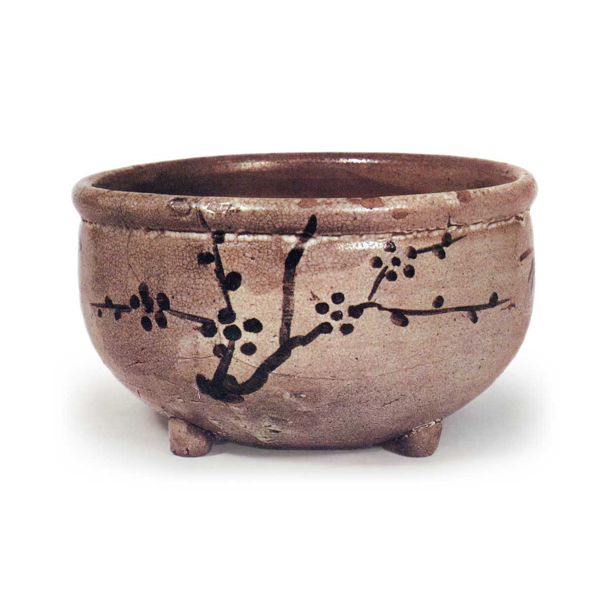 绘唐津竹梅藤纹鉢 唐津绘唐津竹梅藤纹鉢 X Facebook Hatena Bookmark LINE Pinterest 复制 2025.07.29 绘唐津竹梅藤纹鉢 绘唐津竹梅藤纹鉢 高度11.5厘米 口径19.7厘米三脚这件唐津绘画作品在同类中独树一帜,堪称佳作。 碗口采用玉缘设计,底部三面附有圆润低矮的脚,造型独特。 碗身绘制的图案也颇具趣味, 竹、梅、藤花图案以粗笔触描绘,尤其是梅枝的排列方式尤为巧妙。器身全面覆盖着混有土灰的长石釉,口部至器身部分部分有釉流痕。三脚为露胎,展现出细腻柔和的赤土质感。应为甕屋谷窑的作品。 虽难以确定是作为野香炉制作,或是作为碗或水指,但目前作为水指使用。