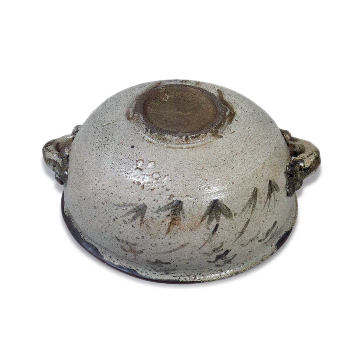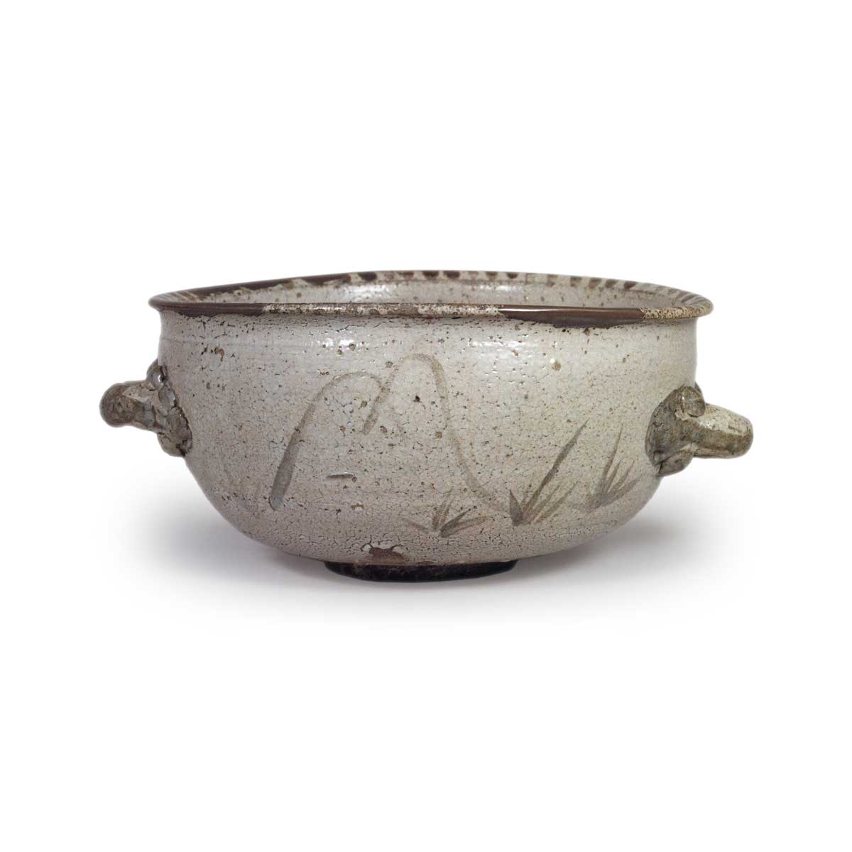 绘唐津山纹手付大鉢 唐津绘唐津山纹手付大鉢 2025.07.29 绘唐津山纹手付大鉢 绘唐津山纹手付大鉢 高度13.2厘米 口径26.5厘米 左右30.7厘米 高台径9.8厘米这款大深鉢造型优美,容量充足。口部尖锐并向外翻卷,器身两侧有粗犷的手把,小巧的高台自然削出,整体略厚实。口部周围点缀斑点纹,内壁圆窗内绘草, 器身一侧上下绘山与草, 另一侧横列五株草,上方绘八只鸟, 铁绘色泽深浅不一, 呈现唐津特有的质朴气息, 同时可窥志野风格的影响。除高台外,全器表面厚涂长石釉,烧成后呈现柔和粗犷的质感。 推测可能出自藤川内系窑炉,但具体出处尚不明确。 这也是绘唐津中罕见的杰作。