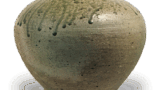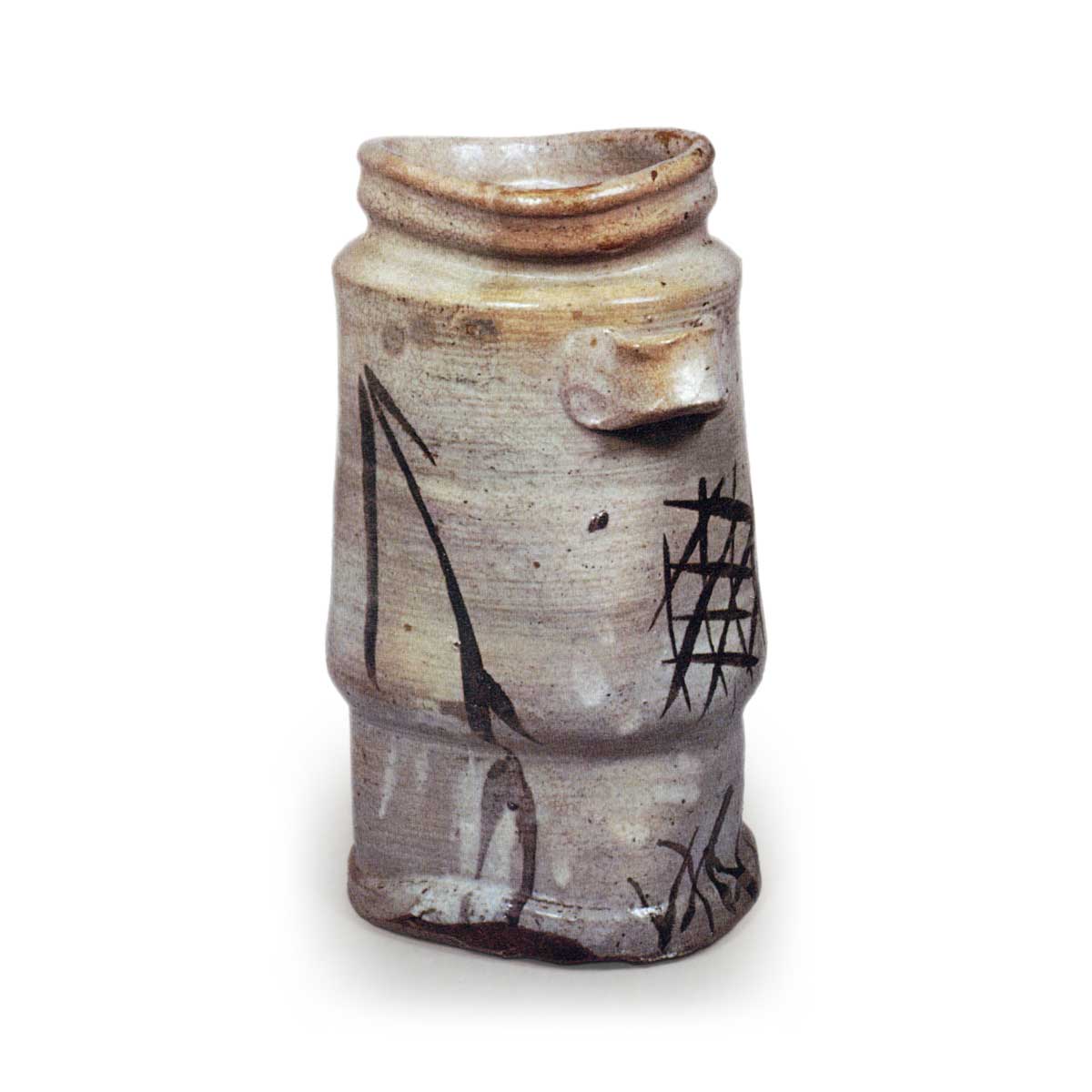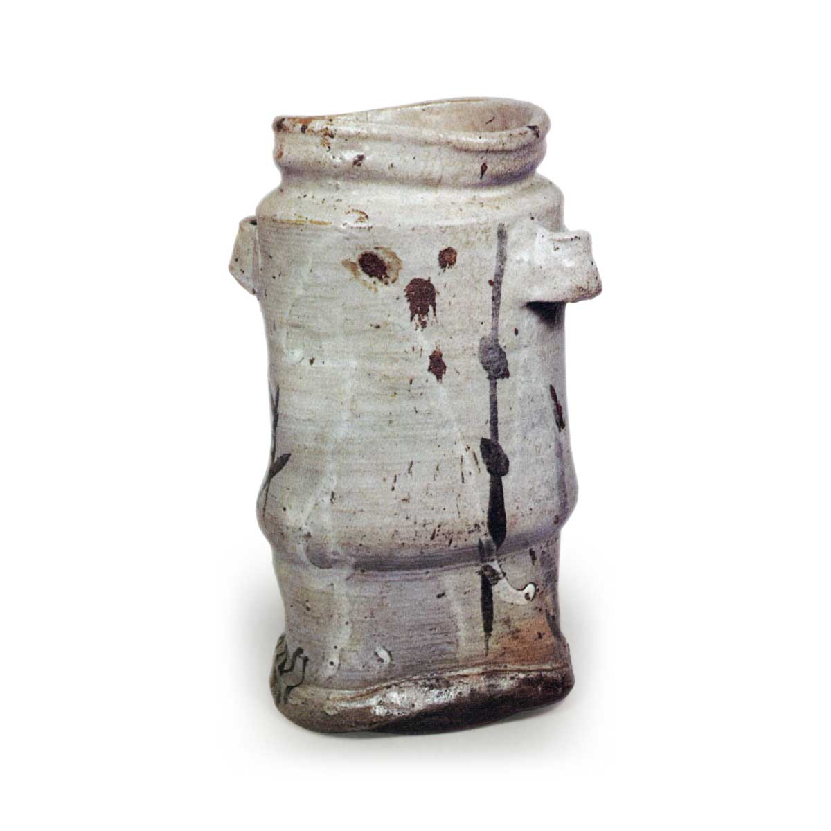 口部扭曲, 瓶身分段并收窄底部, 左右两侧附有大型耳饰, 整体造型较为刻意,采用敲打成型技法,底部平坦。胴体一侧绘有两根类似梅枝的线条,另一侧则绘有柳枝与蛇笼等图案。以简洁笔触象征性地描绘自然景物的风格是绘唐津的特色,但本作将朝鲜技法与和风审美融为一体,即使与同款图案的陶器相比,也呈现出与美浓烧不同的独特韵味。因曾作为挂花瓶使用,前后残有釻痕,底部可见柔和的红色陶土质地。 另有一件类似作品,推测均出自藤川内系窑炉。