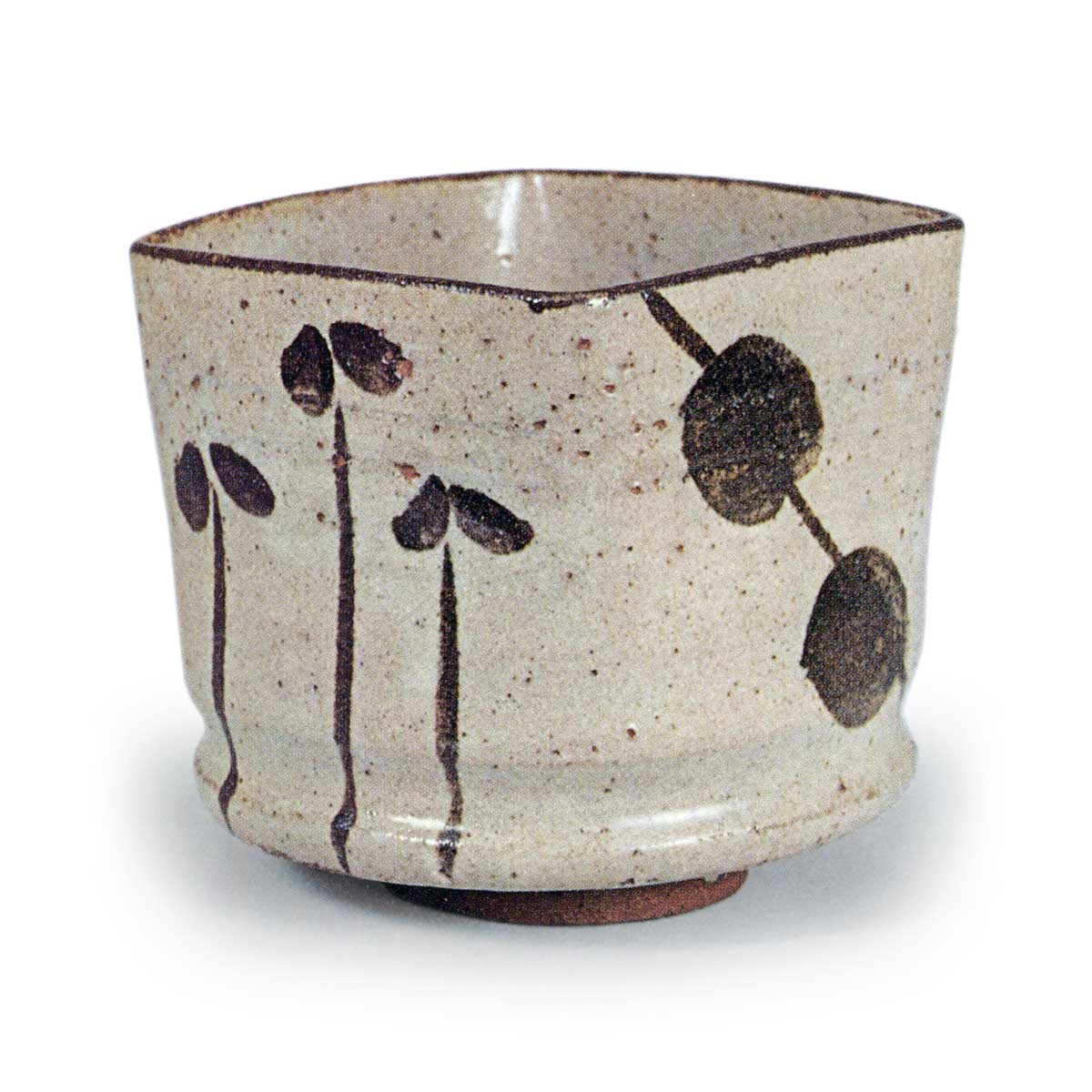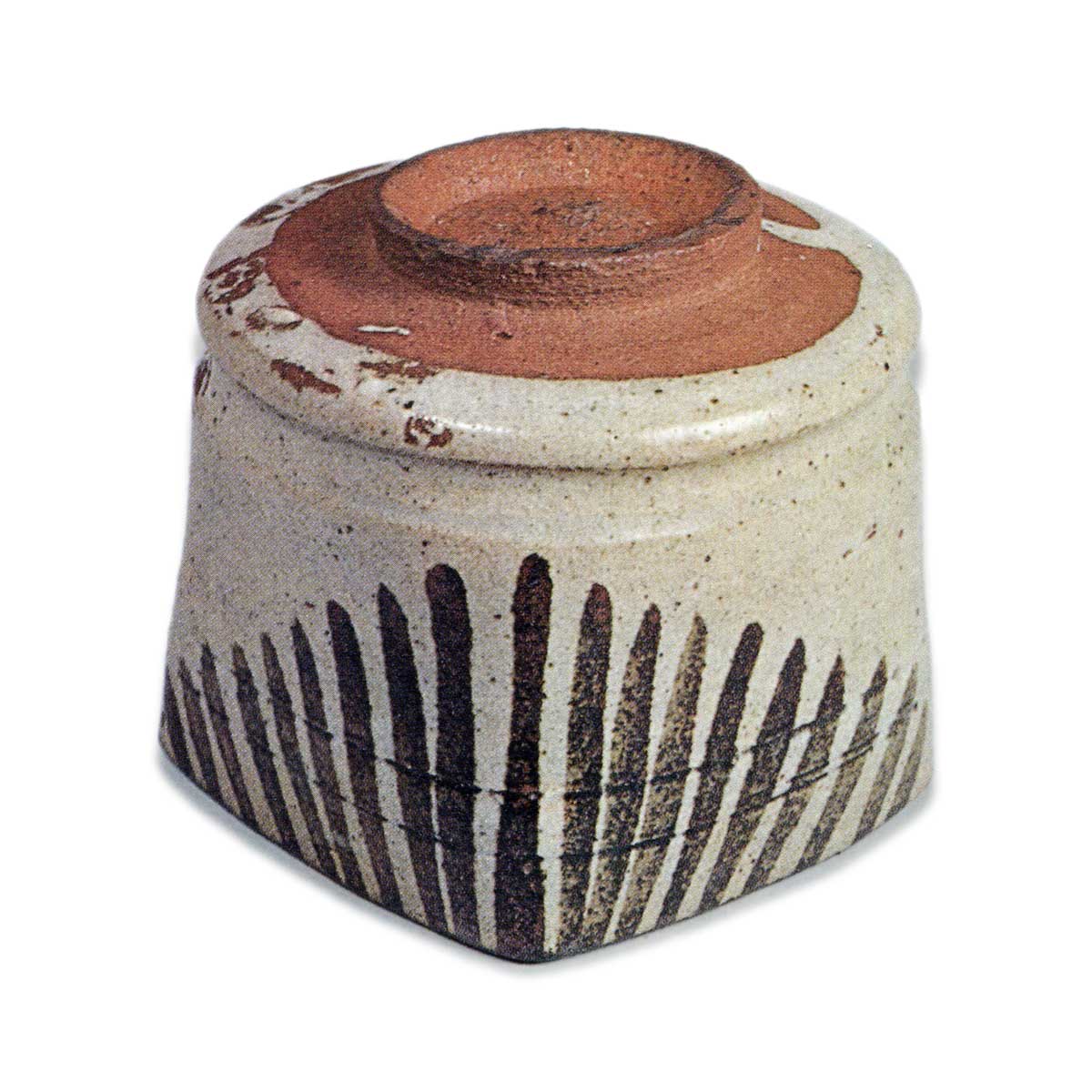 绘唐津串团子纹四方向付 唐津绘唐津串团子纹四方向付 X Facebook Hatena Bookmark LINE Pinterest 复制 2025.07.30 绘唐津串团子纹四方向付 绘唐津串团子纹四方向付 高度8.9厘米,口径8.5×8.6厘米,高台径5.2厘米内田皿屋窑的作品,在众多绘唐津向付中最为洒脱优雅。 该器型稍大,常用于盛放热食。器身底部呈圆形,从口部至器身四面延伸, 边缘以铁绘颜料环绕,一侧绘有放射状线条纹, 另一侧则描绘了串团子与志野风格的箭头纹样。 鼠色底地上铁绘纹样清晰显现,色彩鲜艳。