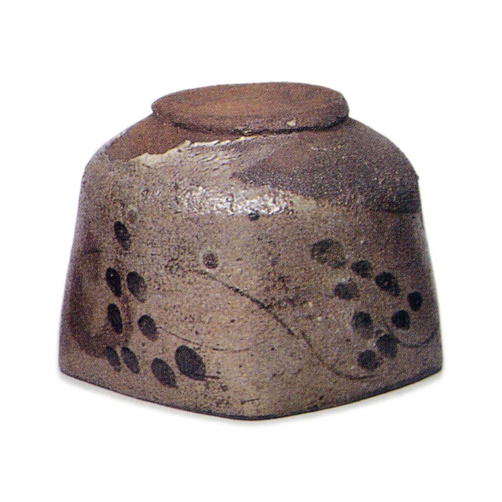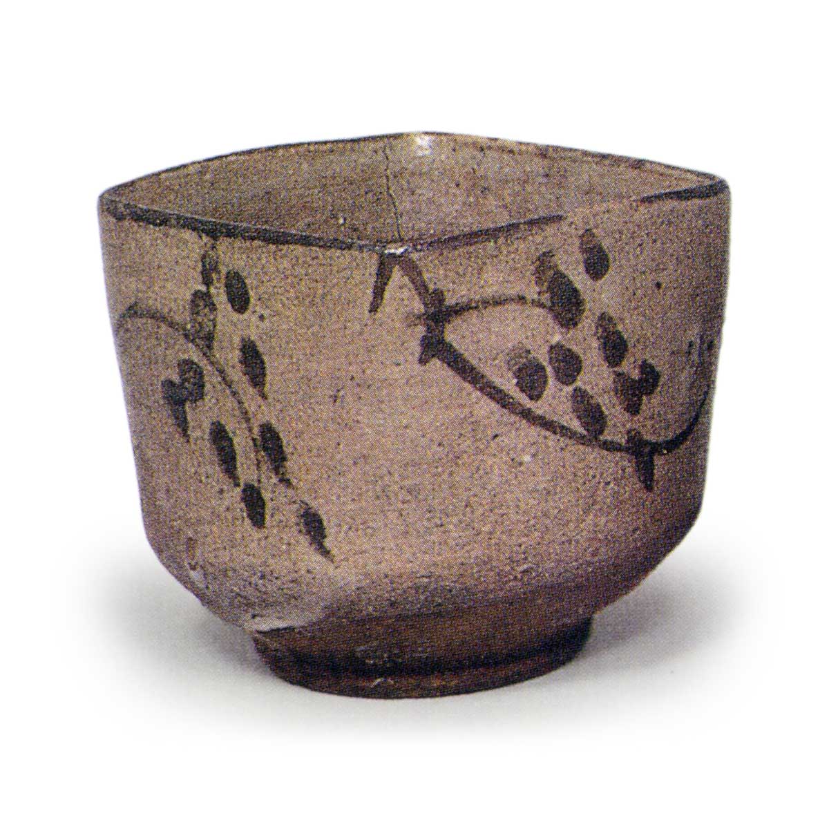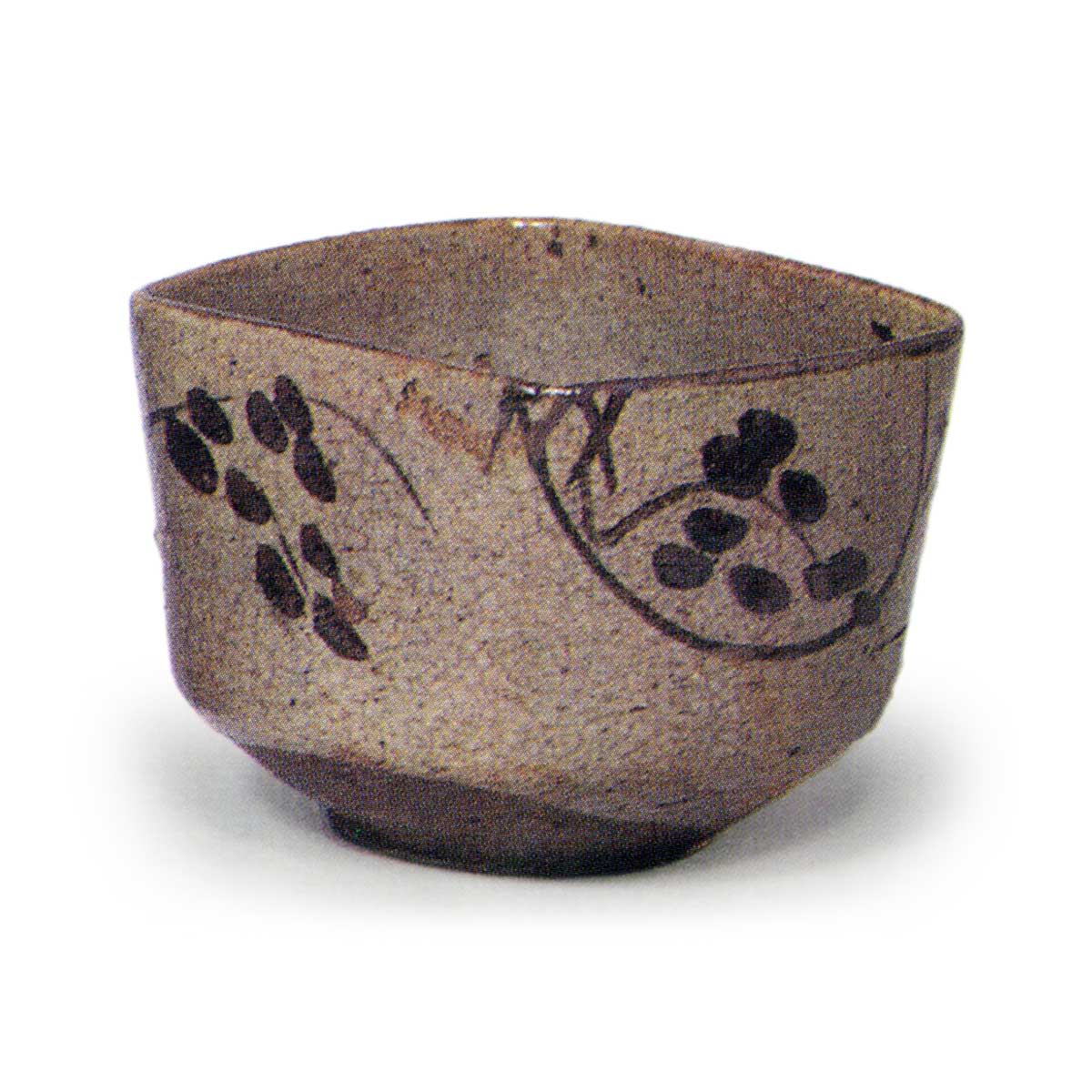 唐津唐草纹四方向付 唐津唐津唐草纹四方向付 2025.07.30 唐津唐草纹四方向付 高度7.2厘米,口径7.1×8.5厘米,高台直径4.8厘米这款小巧的向付充分展现了唐津特有的韵味。碗身以自然展开的姿态立起,四面平滑,高台部分浅削,碗身各面绘有葡萄唐草纹样,笔触轻盈,蕴含着难以言喻的雅致。口部薄,底部厚实。在甕屋谷窑出土的陶片中,有与这件作品笔触相似的陶片。