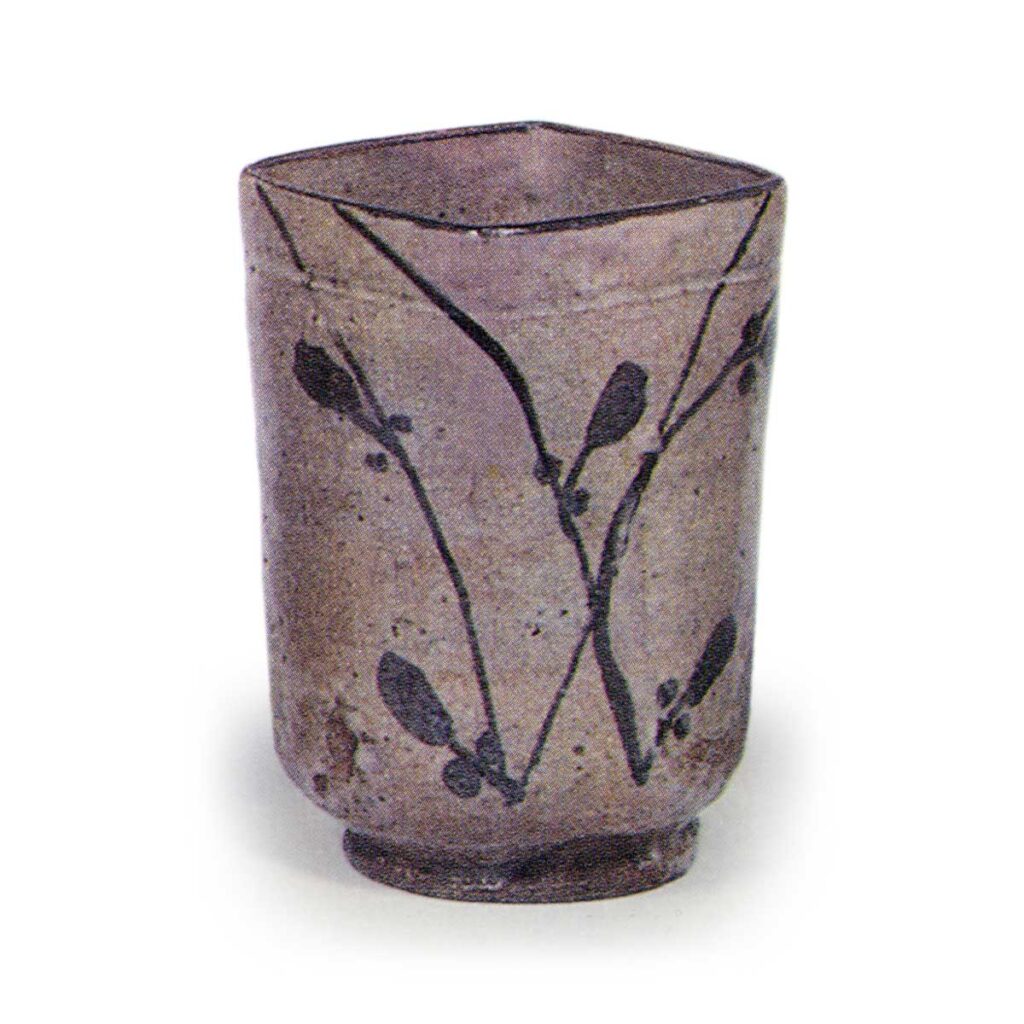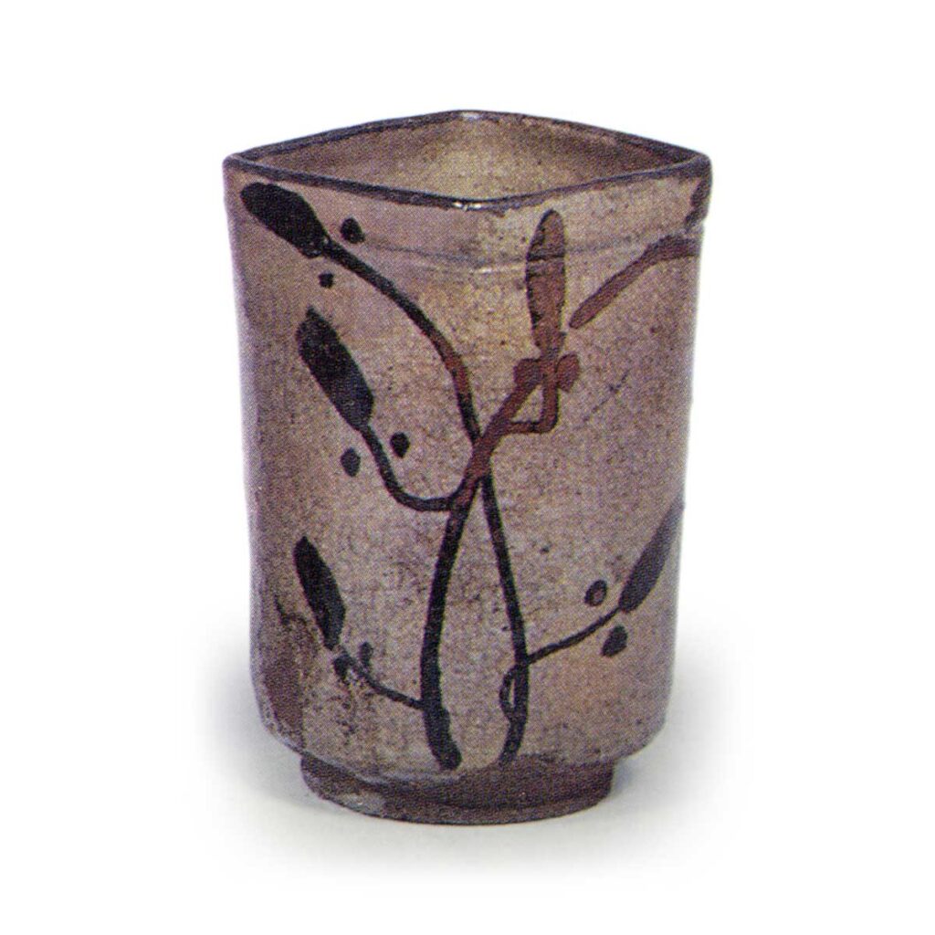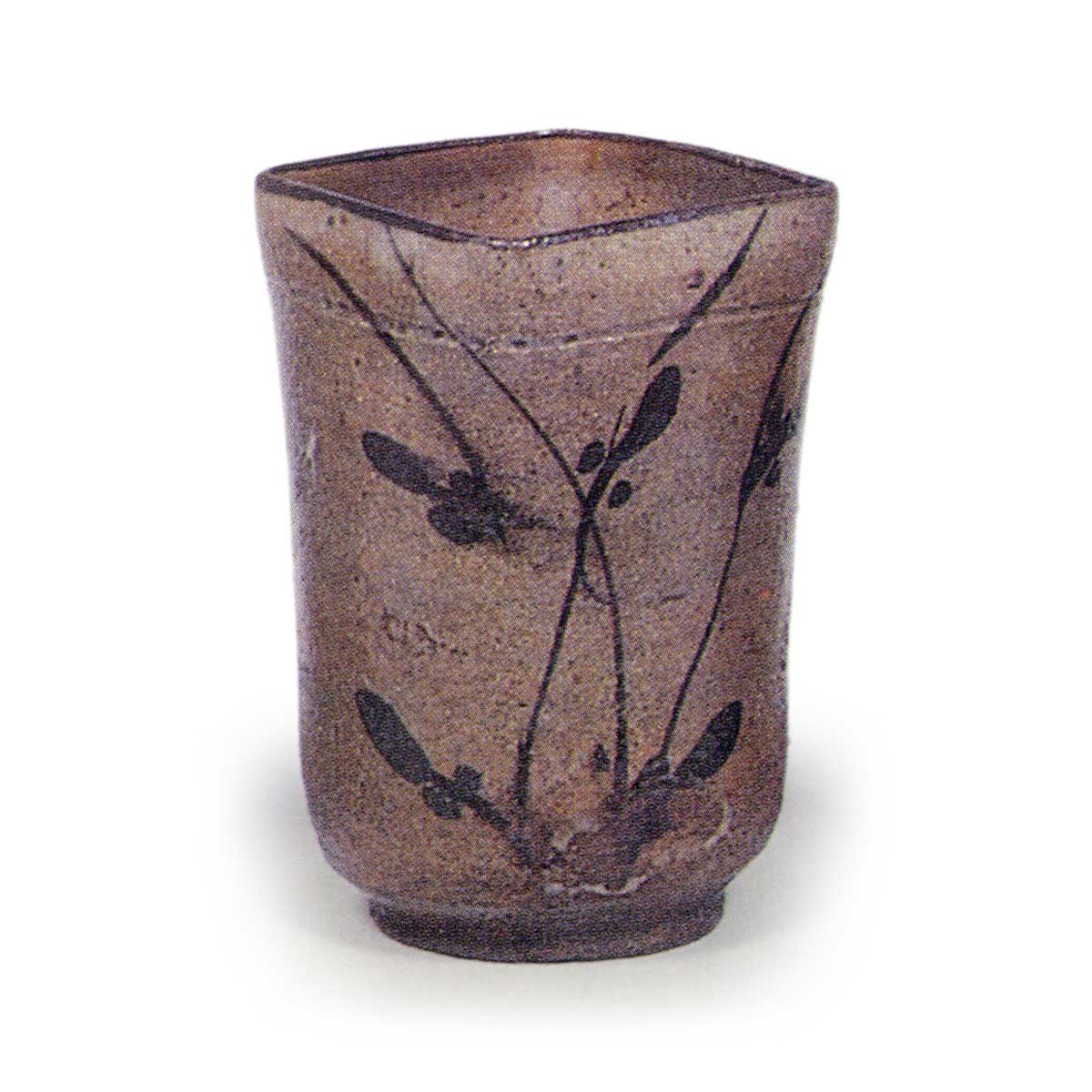 绘唐津草花纹四方筒形向付 唐津绘唐津草花纹四方筒形向付 2025.07.30 绘唐津草花纹四方筒形向付 高度8.3厘米,口径5.1×5.1厘米,高台径4.1厘米田中丸收藏筒形向付,口部呈四方形。 器身两侧各绘有两株草花纹样,雅致十足。 全体采用薄壁制作, 高台以竹节纹样雕刻而成。 陶土细腻,釉面带红润,质地柔和。 虽作为向付略显纤细, 但作品蕴含深厚韵味。