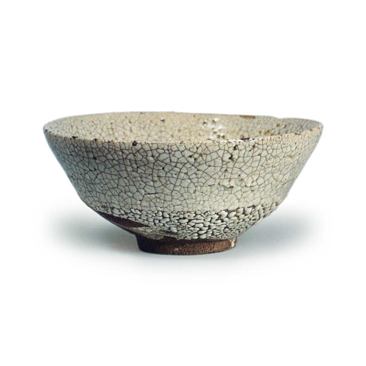 瀬戸唐津茶碗 唐津瀬戸唐津茶碗 2025.07.31 瀬戸唐津茶碗 高度6.3厘米 口径9.6厘米 高台直径5.1厘米出光美术馆茶碗口部浅而宽广,低矮的高台显得小巧,高台内部的削痕也较浅。高台周围保留厚实的长石釉,呈现粗犷的釉裂纹, 腰部至裙边也显现出粗犷的梅花皮纹理。 碗内浅处镶嵌镜面, 周围残留三处釉痕, 粗犷的土质呈白色。 作为本手瀬戸唐津茶碗,具有极高的艺术价值。