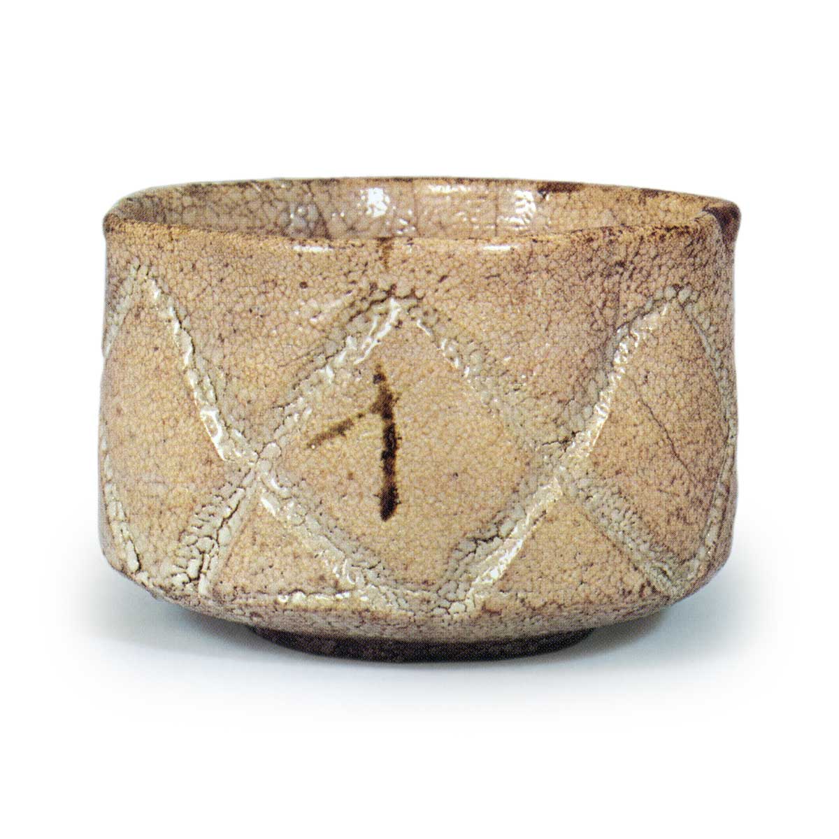 雕绘唐津茶碗 唐津雕绘唐津茶碗 X Facebook Hatena Bookmark LINE Pinterest 复制 2025.07.31 雕绘唐津茶碗 高度9.0厘米 口径12.3厘米 高台径7.2厘米半筒形的茶碗,高台较低,呈双高台风格。整体厚实,碗身圆润,口部向四面延伸。碗身六面刻有深邃的×形雕刻纹样,除高台外,全釉面厚涂长石釉,雕刻部分呈现梅花皮状。此外,碗身三面在长石缎釉上以铁釉绘制小型十字纹样,但通常铁绘应位于釉下,此处罕见地绘于釉上。口部平坦,整体造型与瀬戸黑等相似的半筒形。 陶土呈白色,高台处有两个贝壳状痕迹。 推测为饭洞甕下窑的作品。
